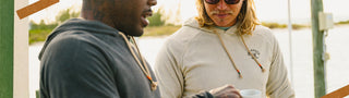 • A dark gray cotton blend hoodie with a woven jacquard yoke featuring colorful stripes and geometric designs across the shoulders and hood. The hoodie has long sleeves, front pockets, and vibrant Baja hoodie-inspired patterns. A man in a baja hoodie stands by a riverbank, holding a can and smiling. Lush green bushes and trees surround him, with mountains in the background and a small campfire burning in the foreground.