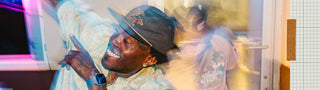 • A black corduroy unstructured snapback baseball cap with green trim and embroidered text reading Somos Verdes and Howler Bros on the front, part of the 2024 Verde Collection inspired by Austin FC. The background is a light beige color. A man wearing a black Austin FC Unstructured Snapback that reads Somos Verdes and a grey t-shirt leans forward, aiming a pool cue in a dimly lit, colorful pool hall.
