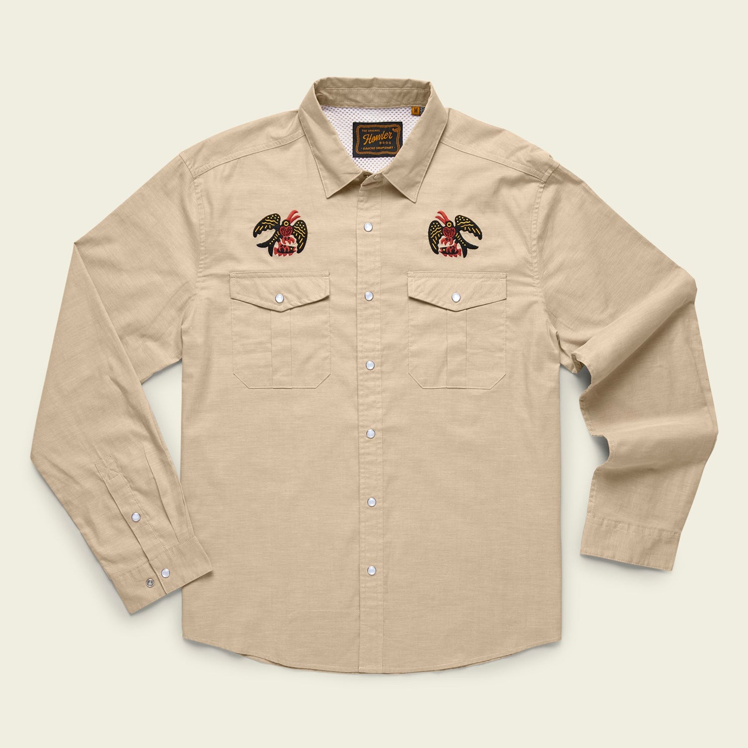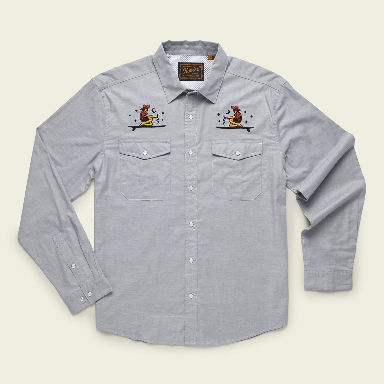 Our desire to make the Gaucho Snapshirt is one of the reasons we started Howler Brothers in the first place. We wanted to transform the vintage western shirts of the past into something technical and wearable in everyday life while maintaining a little of their quirky nature and penchant for unique, embroidered artwork. We succeeded in a big way by making ours out of lightweight, quick drying cotton-poly blend and adding a cooling mesh-lined vented back yoke to keep it cool when the temperatures are cooking. We threw in pleated chest pockets, pearl snaps, and an ever-evolving slate of custom embroidery.