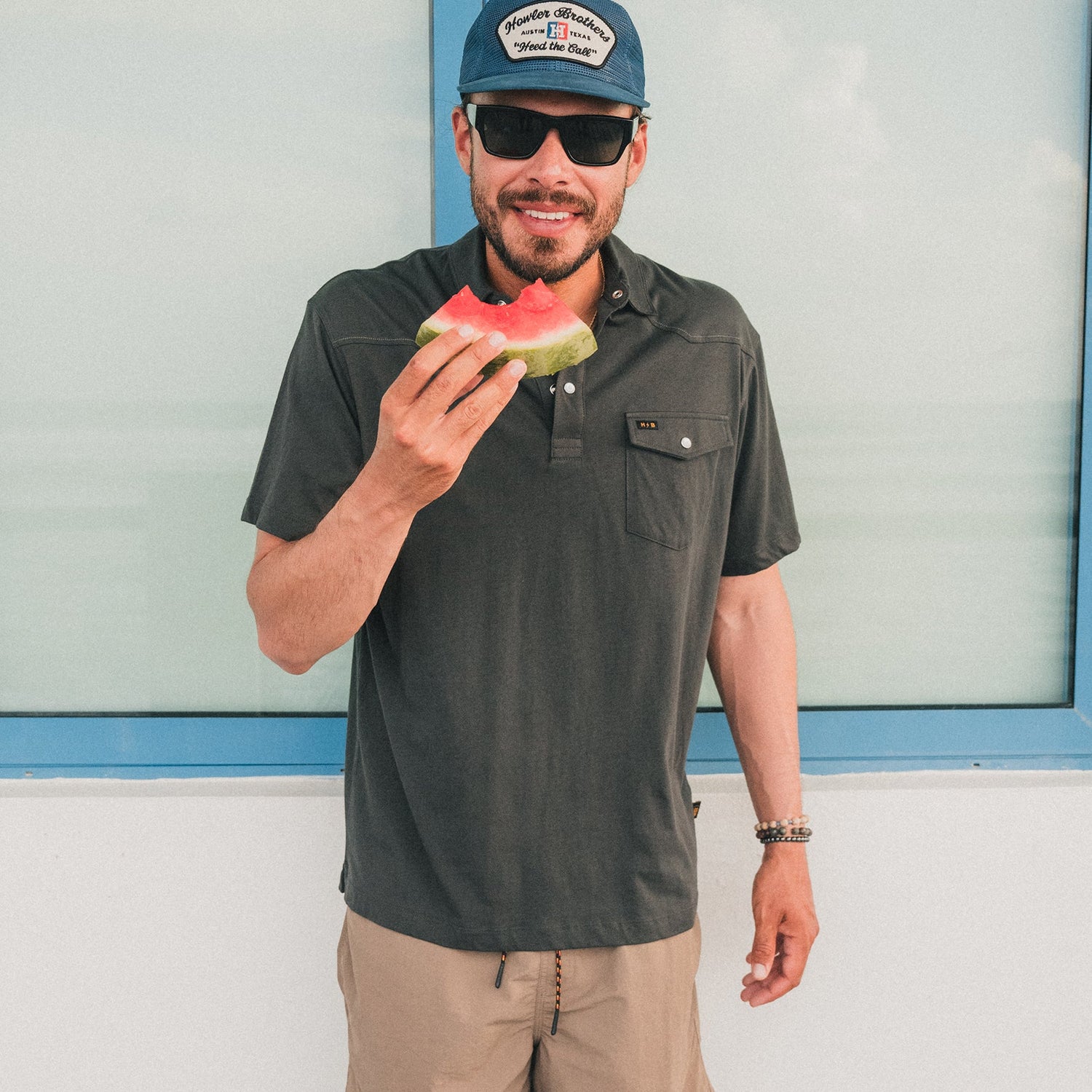 The Ranchero Polo has all the versatility of your favorite staple polo but is a major style upgrade with its cool single pocket design, pearl snaps and subtle western style yoke. Made of super soft 100% heathered cotton you have come to expect from Howler with a straight hem for untucked wear. One of the best sellers in our Austin retail stores every season.